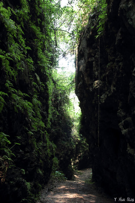 盤龍峽谷一線天位於大崗山後山半山腰,因近百公尺長的石灰岩地形長滿盤龍木,而取名為「盤龍峽谷」,兩旁石灰岩壁鬼斧神工,行走其間山風沁涼拂面,堪稱是大崗山秘境。大崗山風景區有石母乳、情人洞、減肥洞及盤龍峽谷等地質景觀,石母乳入口隱於碧水洞寺後方,循石梯上行,數分鐘後,視野迥然不同,由綠意蕩漾變成峭壁嶙峋的峽谷風光,谷峰間劃開一條逶迤小徑,峰頂綠意掩映,陽光從葉縫中透進來,更添幾許獷味。