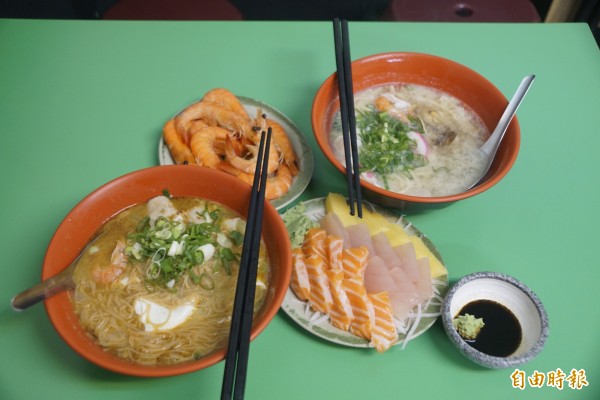 點碗鍋燒麵配上一盤生魚片,花不到300元就可品嚐當令鮮魚的美味。(記者黃佳琳攝)