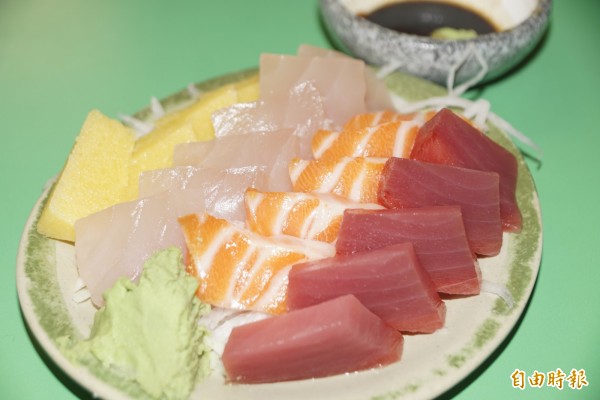 常客劉先生說,內行的吃法,就是點一碗鍋燒麵,再叫老闆切一份生魚片,一口麵、一口生魚片,再喝上一口湯,花不到300元,就能吃到連高檔日本料理店裡都品嚐不到的好滋味。1份200元的生魚片新鮮又好吃。(記者黃佳琳攝)