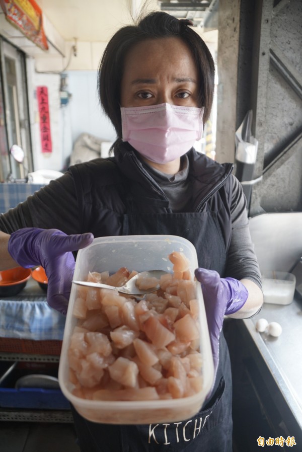 這間沒有店名的生魚片專賣店,位在旗山警分局對面,店坪相當小,僅容得下兩桌客人內用,大部分客源以外帶居多;謝美琳表示,他小時侯沒有學好,在外跟人「七逃」,認識現在的老婆彭雅麗後才浪子回頭,想過安穩的生活,卻沒有一技之長,後來透過親友的協助,在旗山菜市場口擺攤賣生魚片。老闆謝美琳每天買進新鮮漁貨販售平價生魚片。(記者黃佳琳攝)
