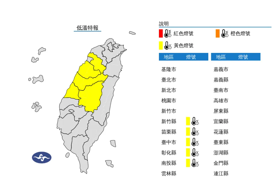 低溫區域【黃色燈號(寒冷)】新竹縣、苗栗縣、臺中市、彰化縣、南投縣有10度以下氣溫發生的機率,請注意。